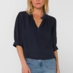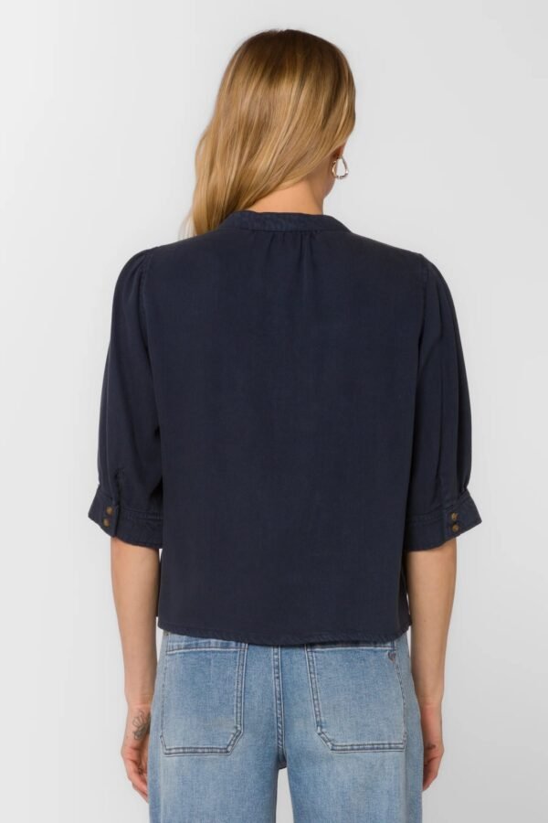 This playful short puff sleeve top in vibrant Patriot Blue is made from a soft. eco-friendly blend of LENZING™ ECOVERO™ viscose and TENCEL™ lyocell. Its lightweight. breathable fabric drapes beautifully. offering a buttery touch that feels as good as it looks. Featuring a mandarin collar. split neckline. and elbow-length sleeves with buttoned cuffs. it effortlessly pops over your head for easy wear and a flirty finish. Perfect for adding a fun. fresh vibe to any outfit!